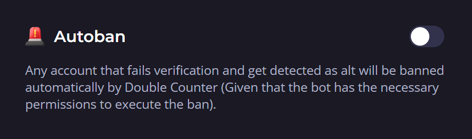 Auto-ban allows you to automatically ban alt accounts when they try to join your server. You will be notified in your logs channel when it happens.