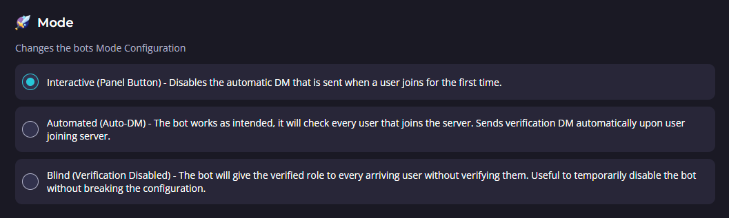 The Mode of the bot will determine how the bot will communicate with members of your server that are going through the verification process.