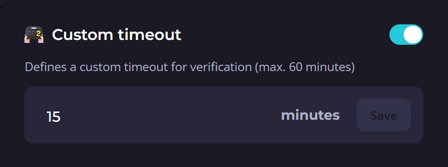 When this feature is enabled, a custom countdown will start for all users joining your server. By default, this will be 10 minutes. You can increase it up to 60 minutes. As explained in Kick after user times out, users that fail to verify in time will be kicked from your server. This also applies to users that fail verification due to Alt Detection.